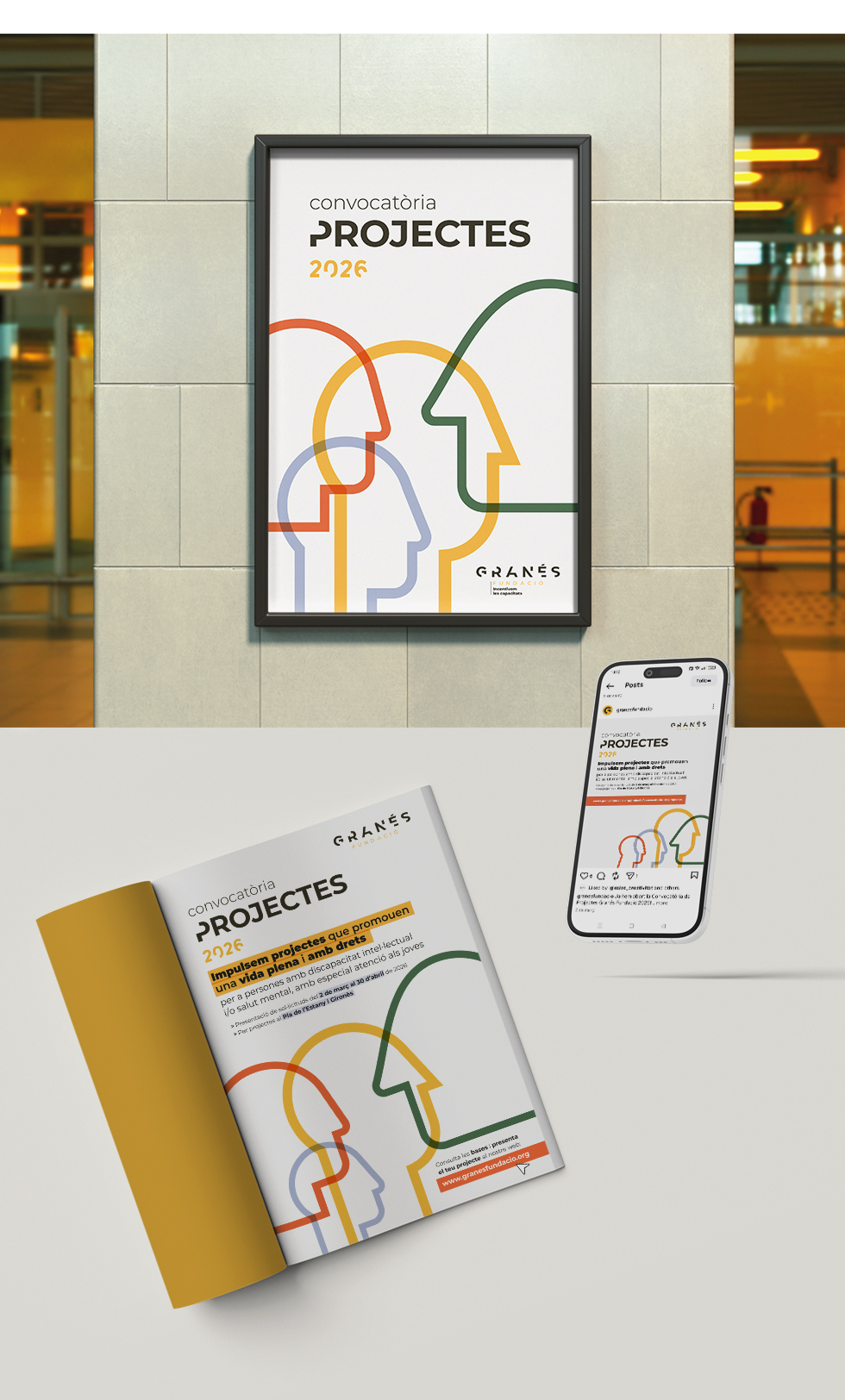 Per a la Convocatòria de Projectes Granés Fundació 2026 hem desenvolupat la imatge gràfica del projecte, construint un llenguatge visual clar, inclusiu i compromès amb els seus valors.